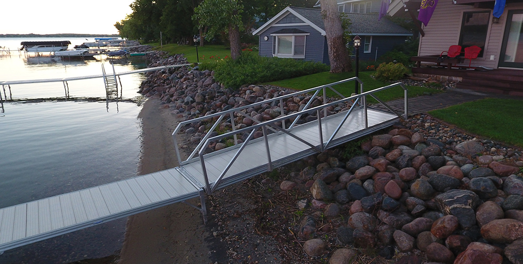 The transition from the shoreline to your dock is important for creating a seamless waterfront experience. The first steps you take toward your aluminum boat dock need to be stable, comfortable, and easy to own and use for years. ShoreMaster has a variety of dock-to-shore transition products and accessories, but one of the biggest choices you’ll make is between ramps and gangways.
